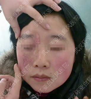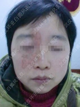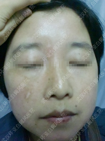 ▲病史:半年前,面部突然一个豆大白斑点,慢慢扩大。涂抹外用药治疗无效来我院治疗