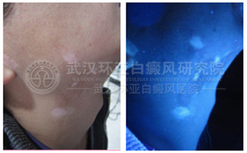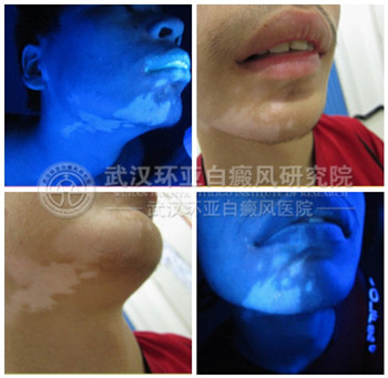 伍德:右耳前、下唇、下颌至颈部白斑,色素脱失达90%;双侧腋前点状轻度色素脱失,色脱50%。