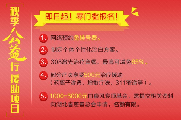 “秋季公益行”,是一项专门针对白癜风患者的公益援助活动。由湖北省和武汉环亚中医白癜风医院联合发起,在指导白癜风患者科学系统祛白的同时,最大限度的给予经济援助。让他们在祛白道路上,少一些顾虑,多一份信心!